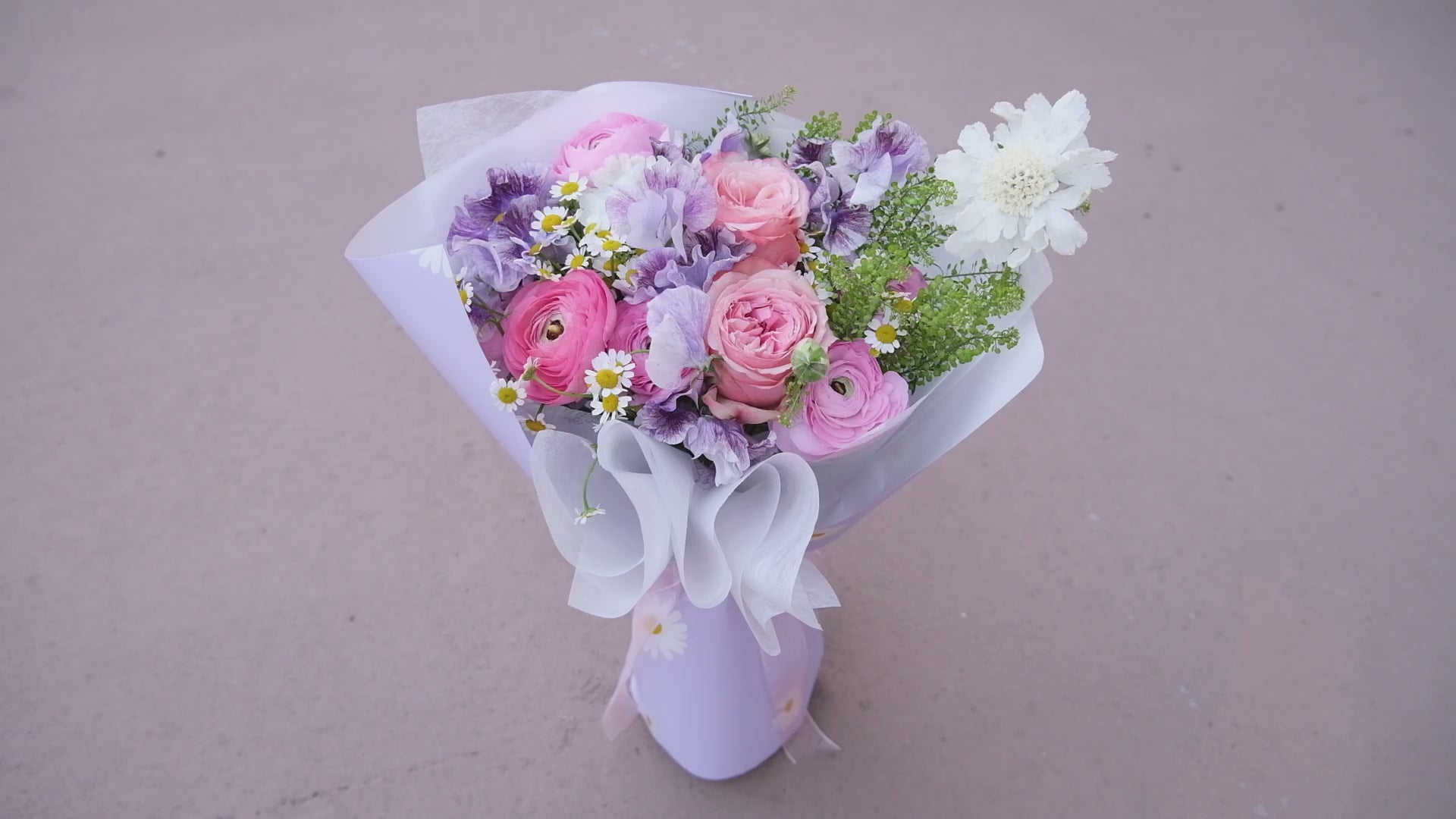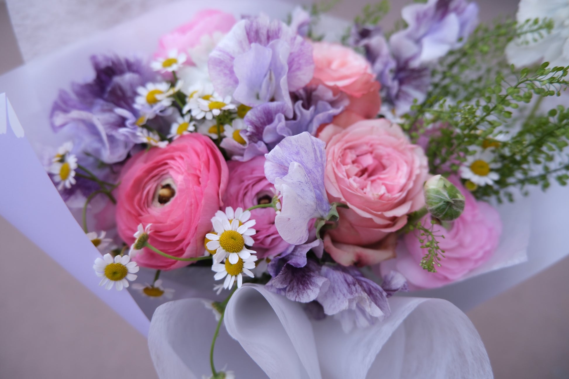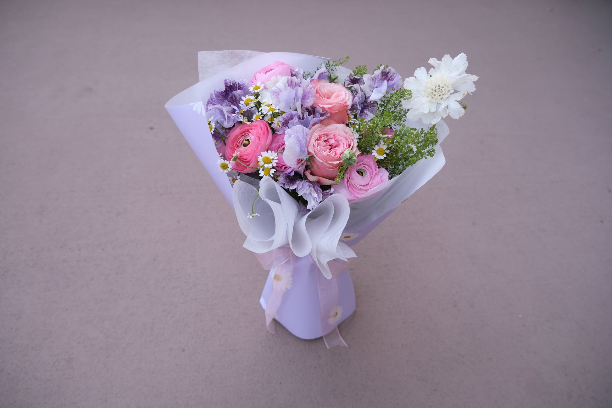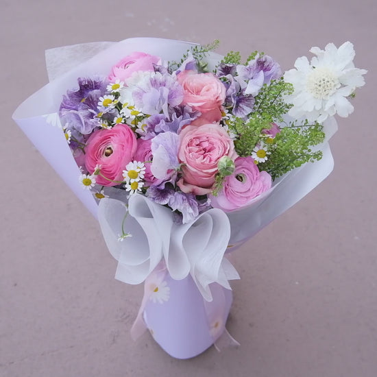 A pastel‑perfect mix of ranunculus, roses, daisies, and fresh greens, wrapped in lavender tones for a soft, elegant look. A beautiful choice for any heartfelt occasion.